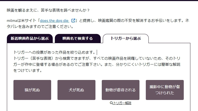 「milma」では映画のタイトルなどから、犬や猫など、動物がひどいめにあったり、性加害やゴア描写などの表現があったりといった、センシティブな要素がその作品に含まれるかどうかを事前にチェックできる。