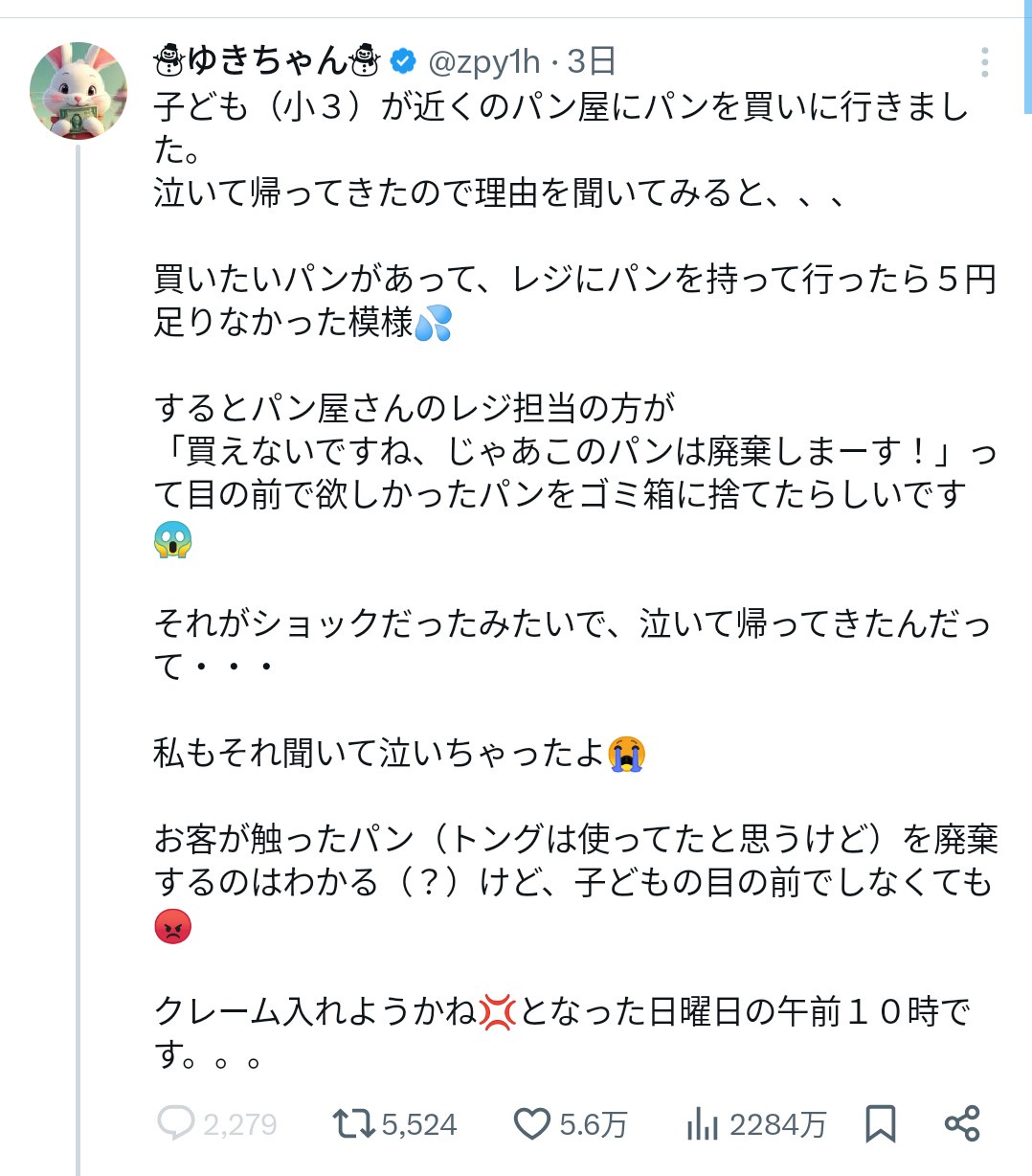 投稿者の母親「ゆきちゃん」さん(@zpy1h)によると、子どもが近所の人気パン屋でメロンパンを買おうとしたところ、手持ちのお金が5円足りませんでした。レジに並びパンを差し出したものの、店員は「買えないですね。はい、廃棄します」と告げ、その場で欲しかったパンを子どもの目の前でゴミ箱に捨てたといいます。