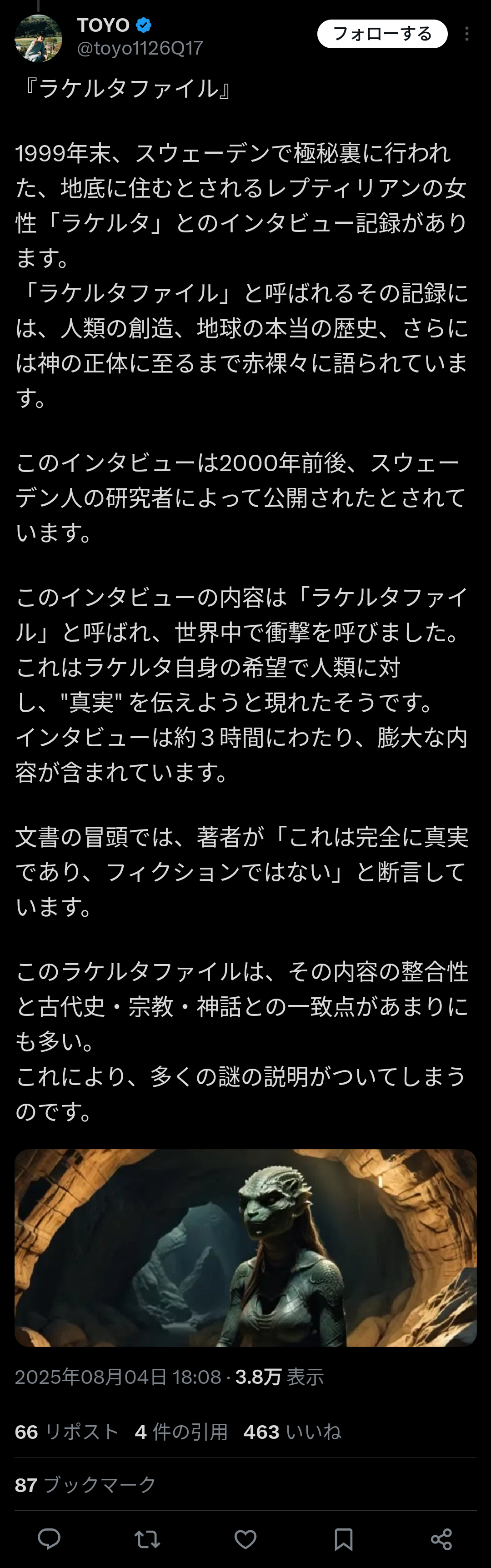 ラケルタファイルというのはレプティリアンの女性とのインタビュー記録のこと